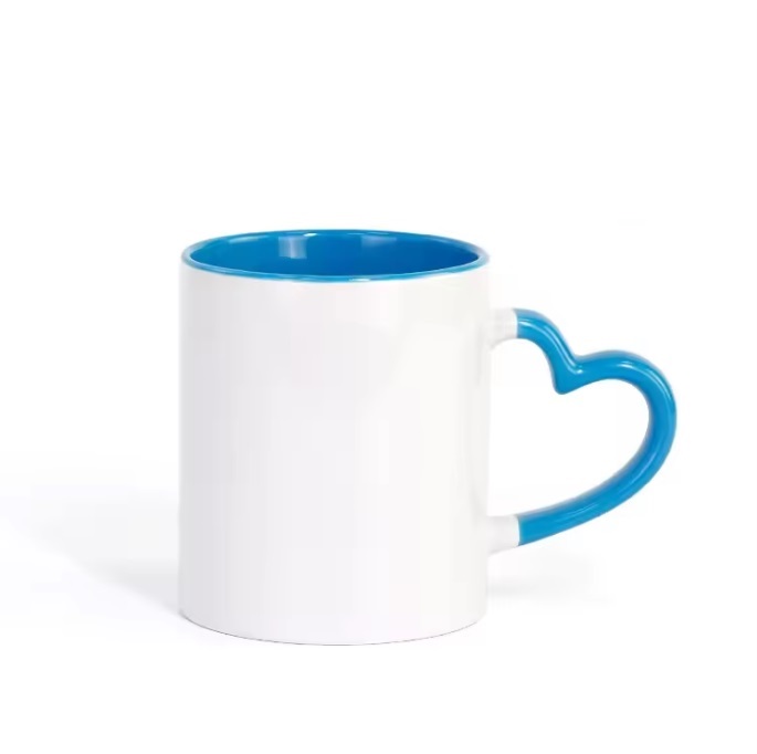 Taza blanca 11oz de color azul en fondo y asa de corazon