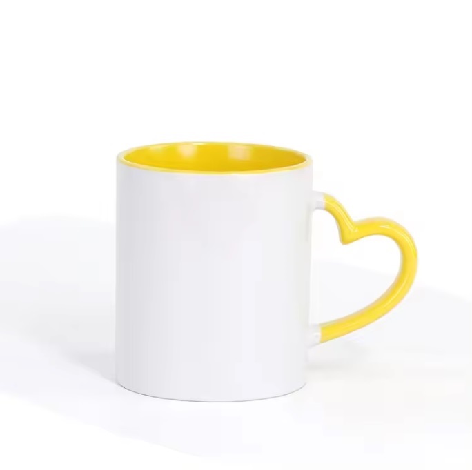 Taza blanca 11oz de color amarillo en fondo y asa de corazon