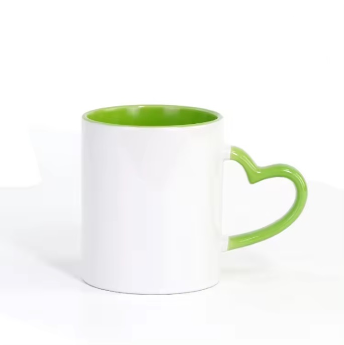 Taza blanca 11oz de color verde en fondo y asa de corazon