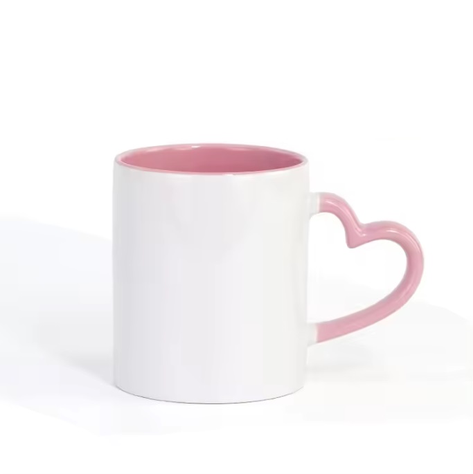 Taza blanca 11oz de color rosado en fondo y asa de corazon