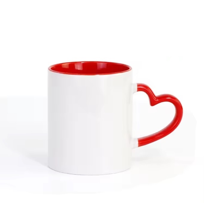 Taza blanca 11oz de color rojo en fondo y asa de corazon